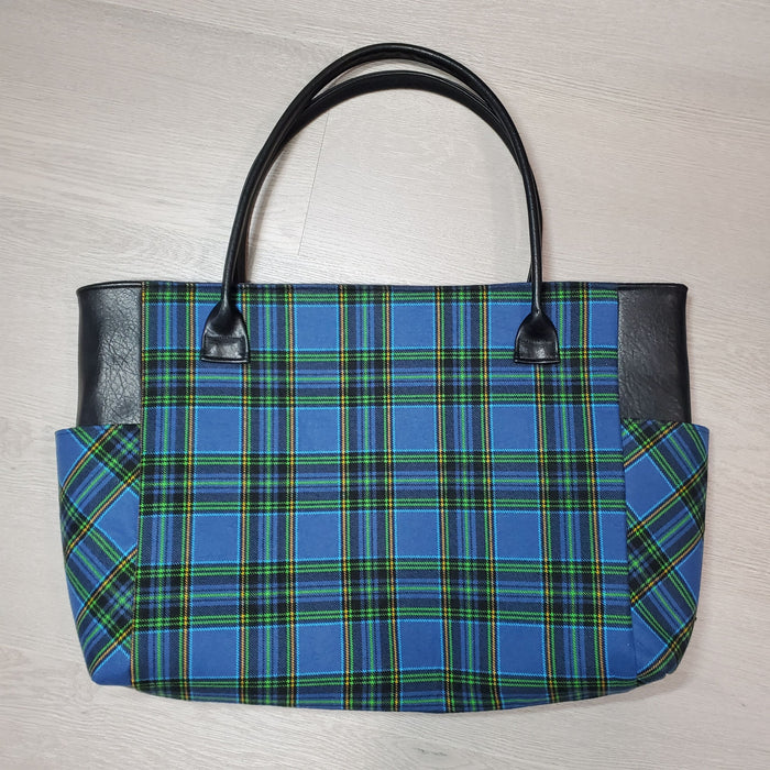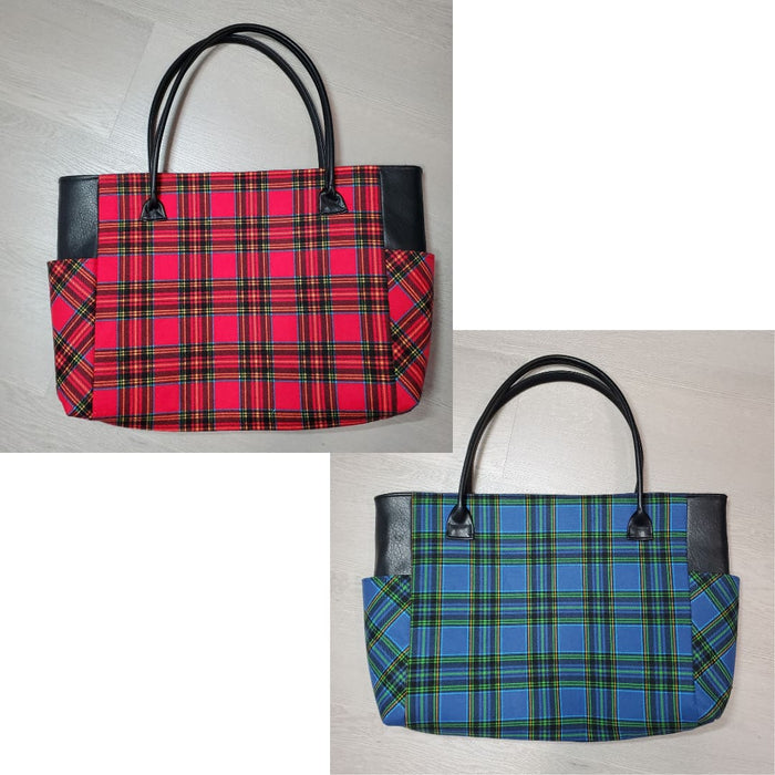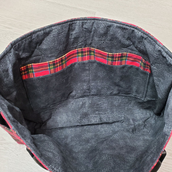 This is an easy tote bag, a great size with side pockets and an inside pocket as well, but no zippers! Its a classy bag totally on trend with our plaid flannels!